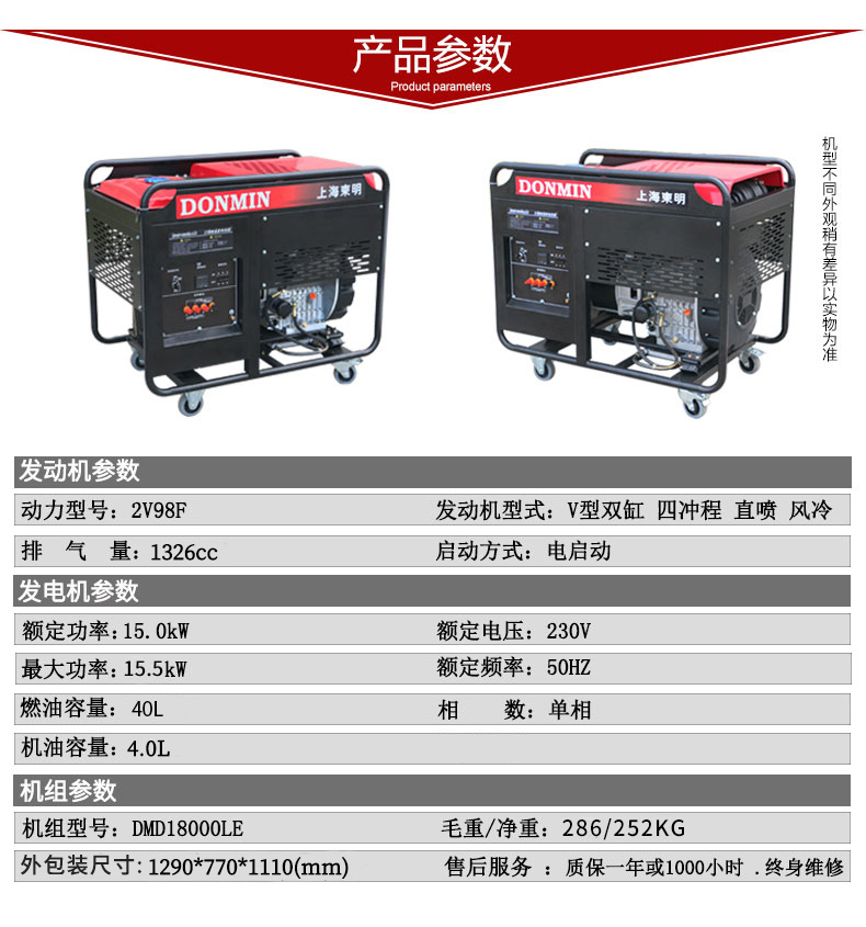 上海東明單相12KW 12000W柴油發電機組DMD15000LE ◆采用雙缸V型結構,動力強勁; ◆大型消音器,動平衡轉軸,低噪音機組設計,采用具有減震功能的外殼與框架; ◆大容量油箱確保長時間的連續工作; ◆無熔絲斷路器提供過載保護,電容電壓調節器,確保穩定電壓輸出; ◆定向輪加萬向輪結構,移動方便。